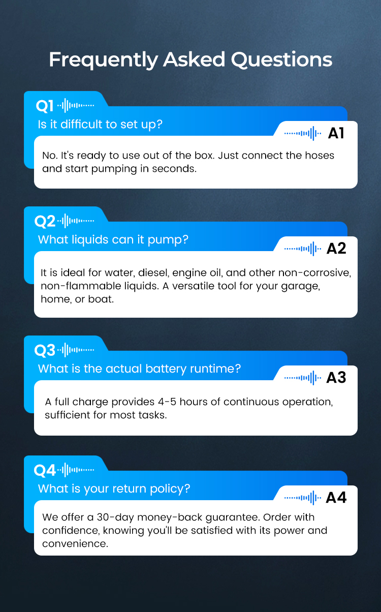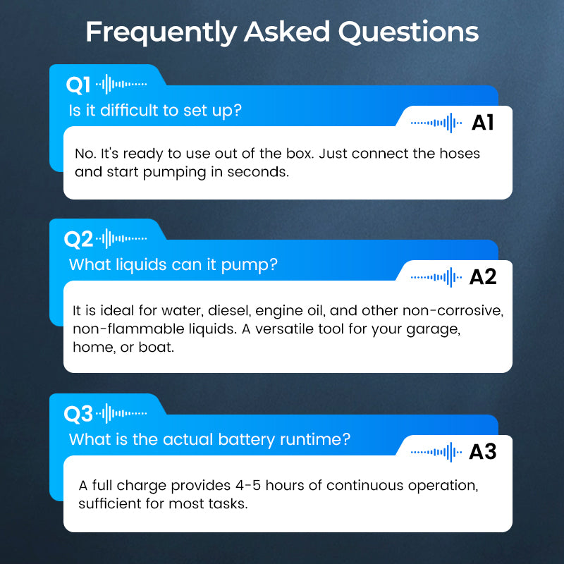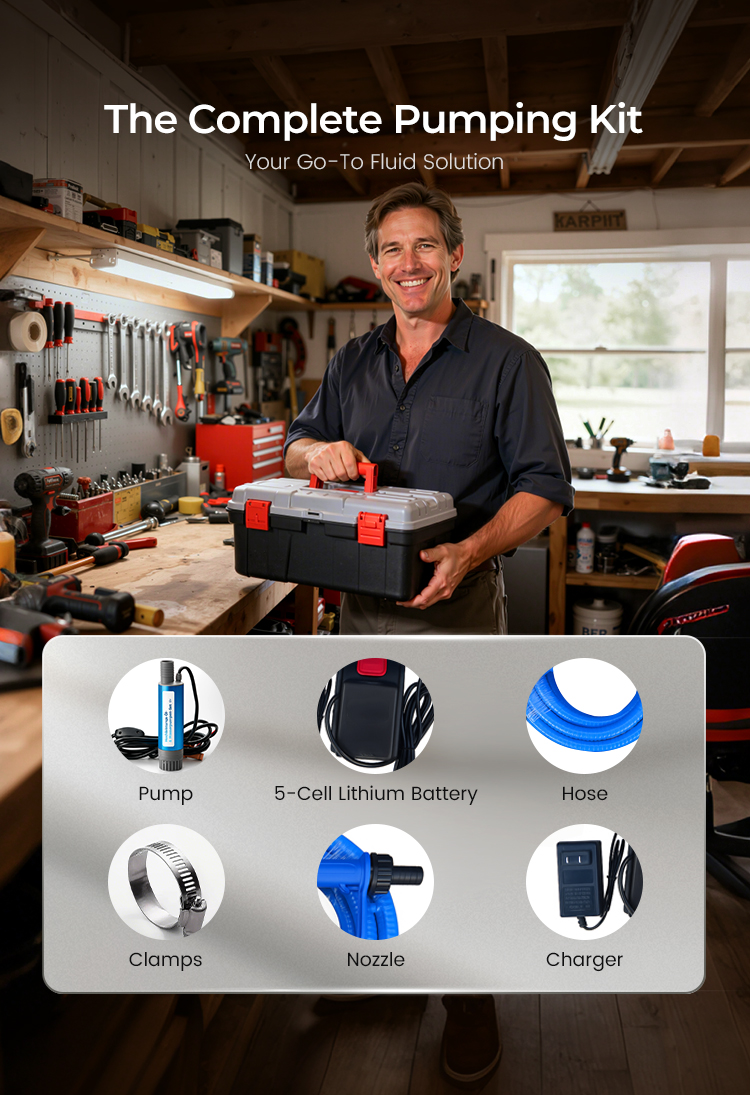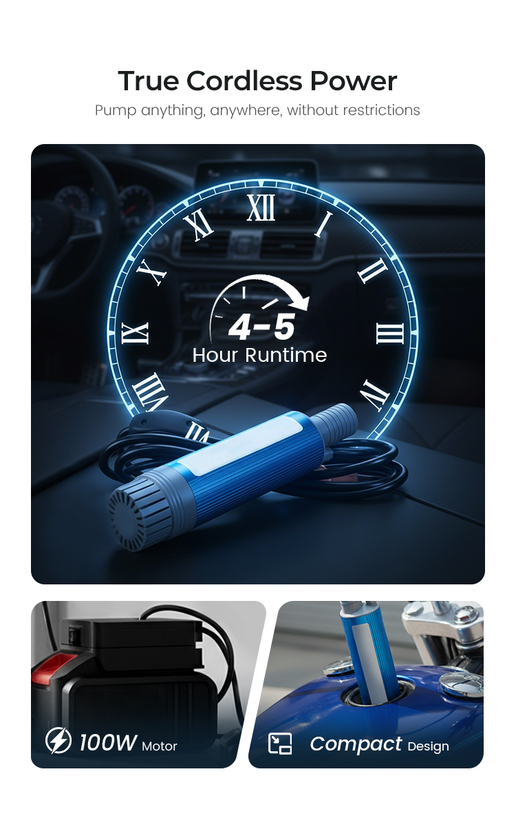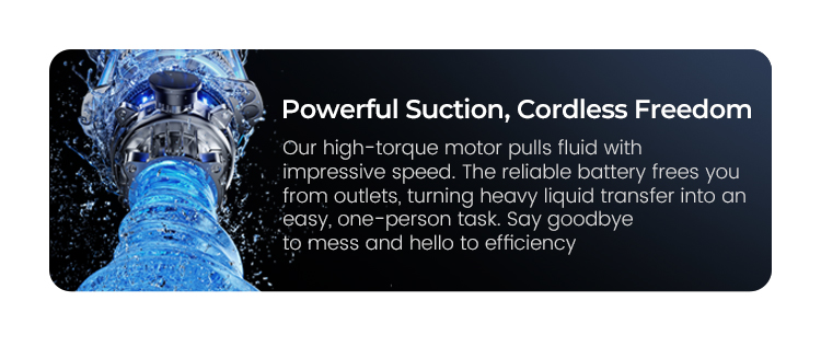 DURABLE CONSTRUCTION: Built with an aluminum alloy pump body and reinforced plastic components, this set withstands tough working conditions. The corrosion-resistant materials ensure long-lasting performance whether you're handling water, oils, or other compatible liquids in demanding environments.COMPACT & CORDLESS DESIGN: The wireless lithium battery operation provides true portability with 4–5 hours of continuous runtime. Its space-saving form factor fits in tight spaces, while the advanced cooling system prevents overheating during extended use.