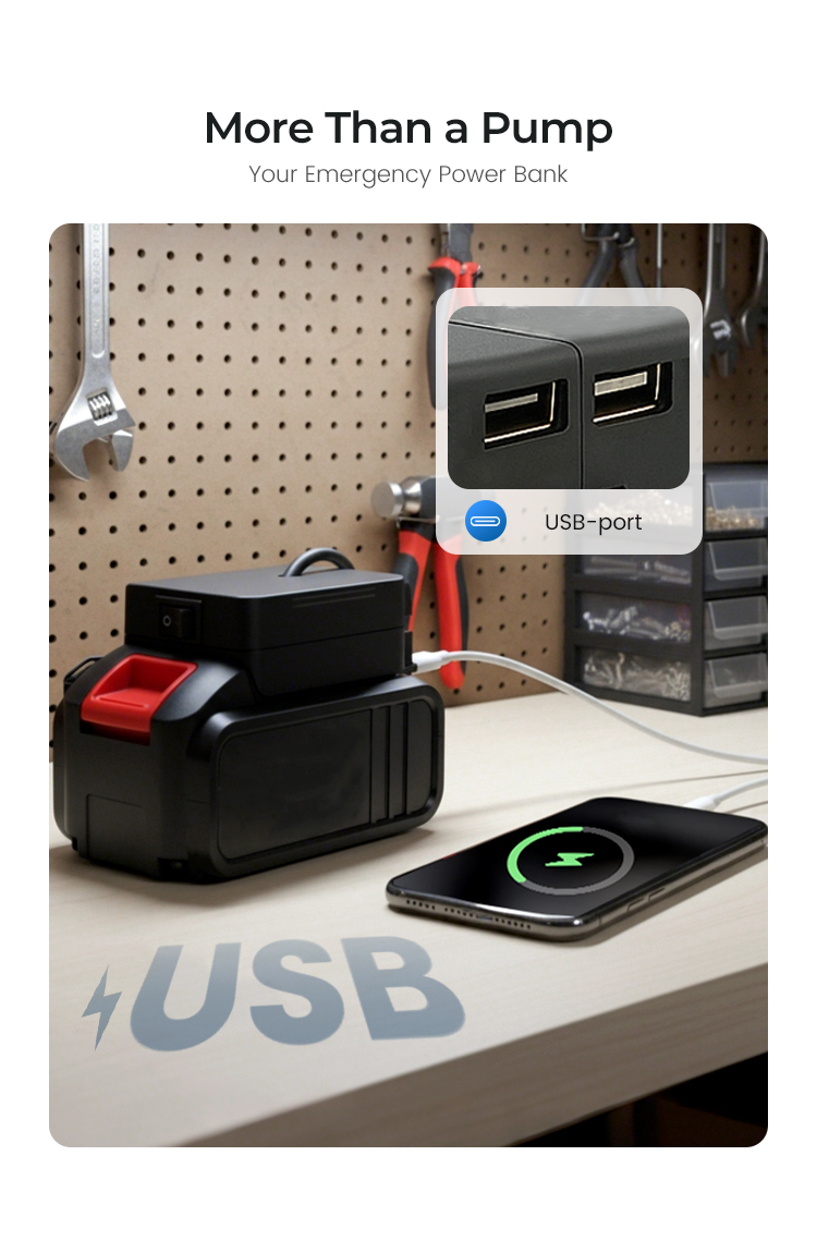 EMERGENCY POWER BANK: Built-in USB port allows the pump to double as a 21V emergency charger for mobile devices. This smart feature ensures you're never caught without power during outdoor work or emergency situations.